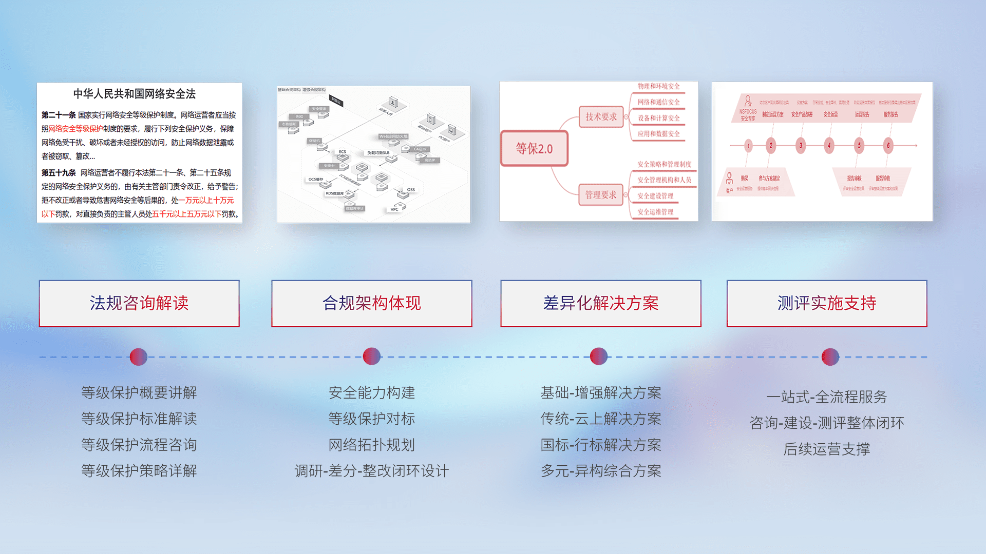 通过专业的法律咨询解读、、合规架构体现、、、、差异化解决方案、、测试实施支持等服务,,,,为客户量身打造等保合规体系。。。